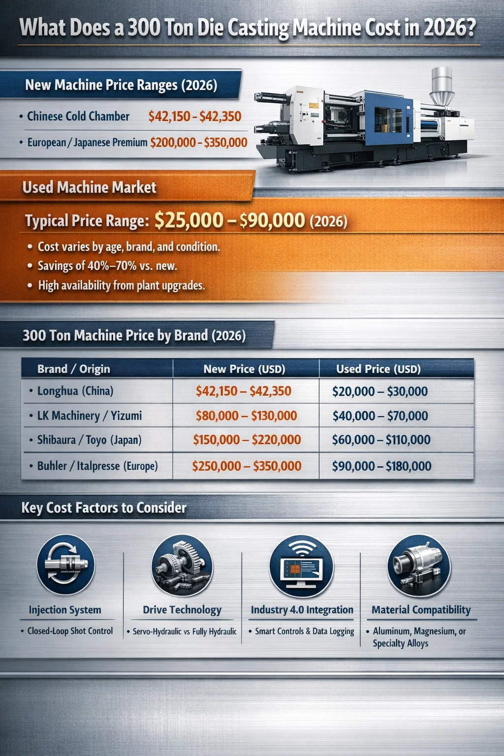 The price of a 300 ton die casting machine in 2026 ranges from $42,000 to $350,000 new, depending on the machine type, origin, and configuration. Chinese-manufactured cold chamber die casting machines at 300 tons, such as the Longhua horizontal high-pressure model, are listed at approximately $42,150–$42,350 per unit from verified factory suppliers. Mid-tier models from established Asian brands like LK Machinery, Yizumi, or Toyo typically fall in the $80,000–$150,000 range. Premium European and Japanese die casting machines at equivalent tonnage — from names like Buhler, Italpresse, or Shibaura Machine (formerly Toshiba Machine) — can push well past $200,000 when new.