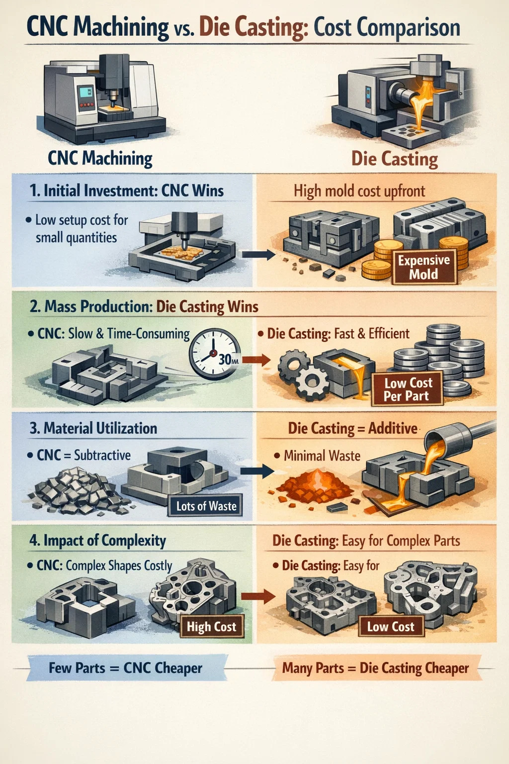 Mengenai sama ada die casting atau pemesinan CNC adalah lebih murah, jawapannya sebenarnya bergantung pada berapa banyak bahagian yang anda bercadang untuk menghasilkan.