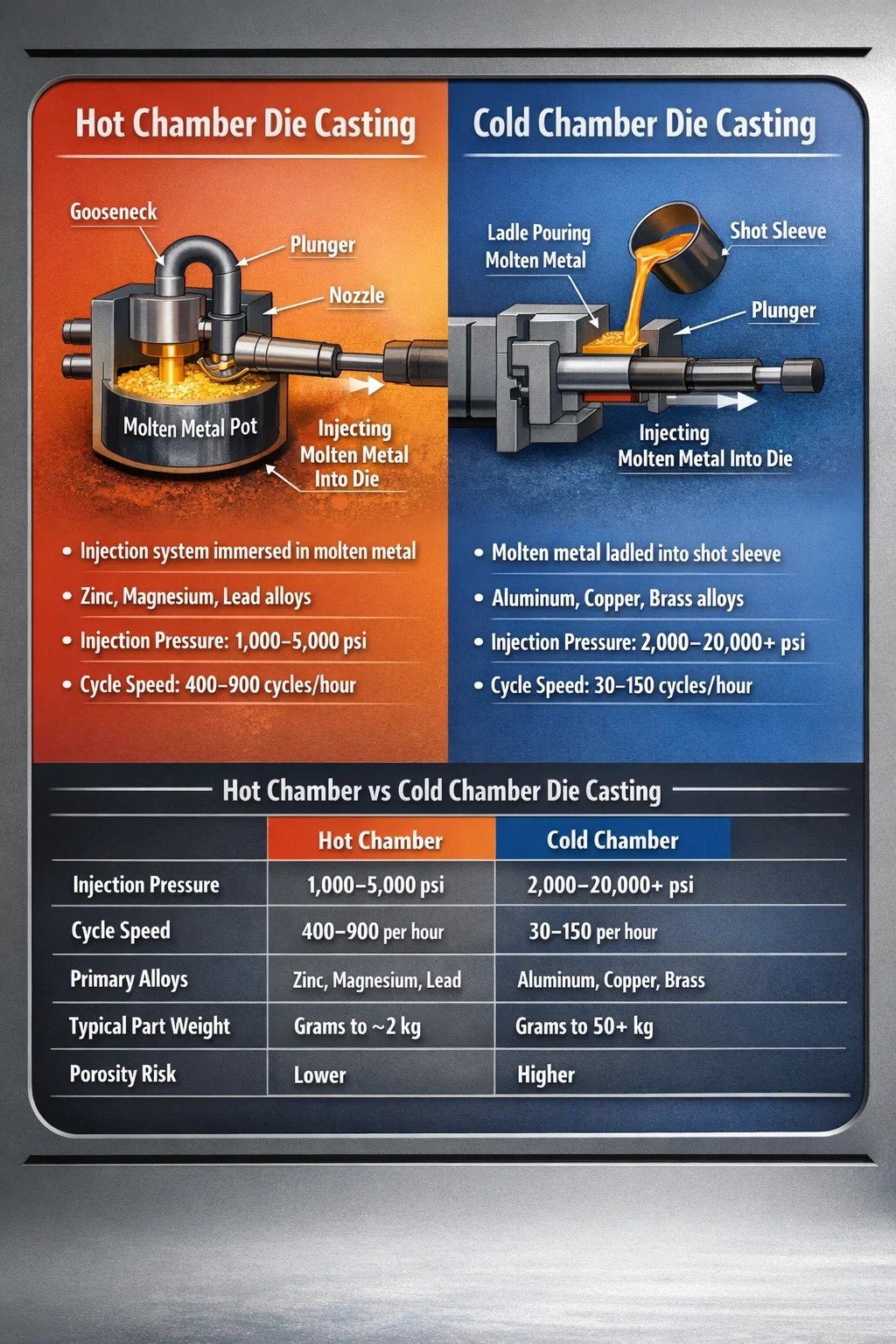 Dua kaedah asas tuangan die ialah tuangan mati ruang panas dan tuangan mati ruang sejuk . Kedua-dua proses ini berkongsi matlamat asas yang sama - memaksa logam cair menjadi acuan keluli yang dikeraskan di bawah tekanan tinggi untuk menghasilkan bahagian yang tepat dan boleh berulang - tetapi ia berbeza dengan ketara dalam cara logam dicairkan, dikendalikan dan disuntik. Memilih kaedah yang salah untuk geometri aloi atau bahagian anda boleh mengakibatkan isian yang lemah, keliangan yang berlebihan, haus cetakan pramatang dan kadar sekerap yang mahal. Memahami perkara yang memisahkan kedua-dua kaedah ini adalah titik permulaan untuk sebarang keputusan tuangan yang serius.