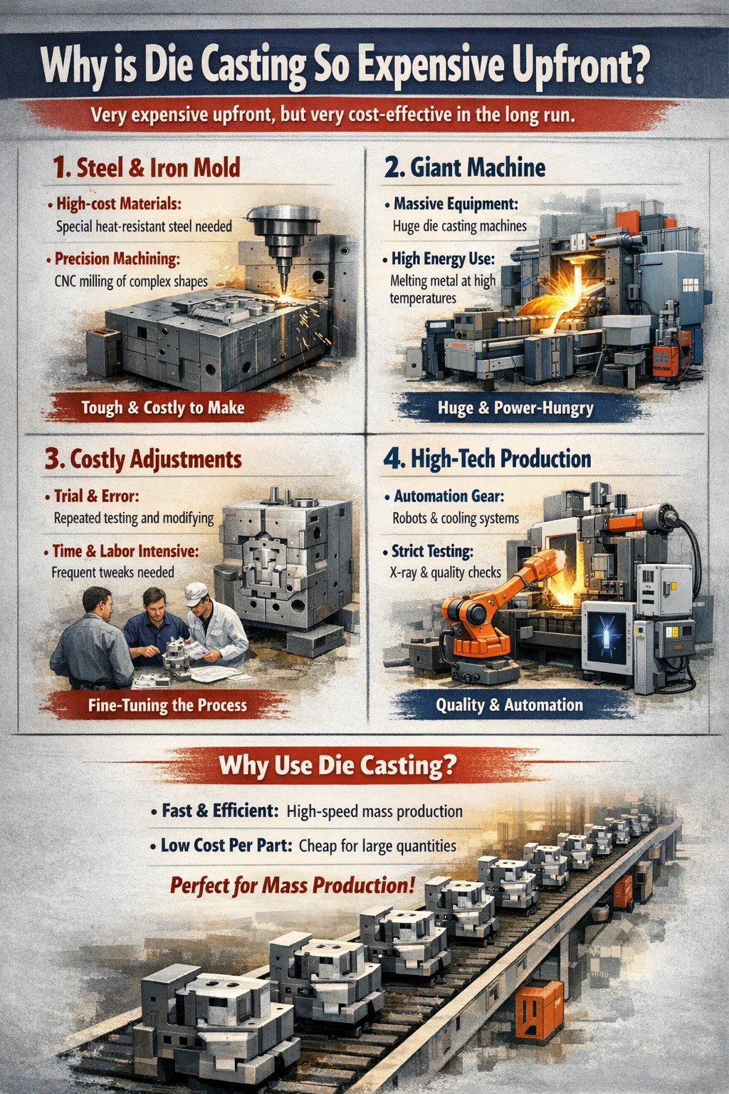 sebenarnya, die casting sememangnya satu proses yang "sangat mahal di hadapan, tetapi sangat kos efektif dalam jangka masa panjang." Kosnya yang tinggi ditunjukkan terutamanya dalam pelaburan awal. Kita boleh memecahkan proses ini: