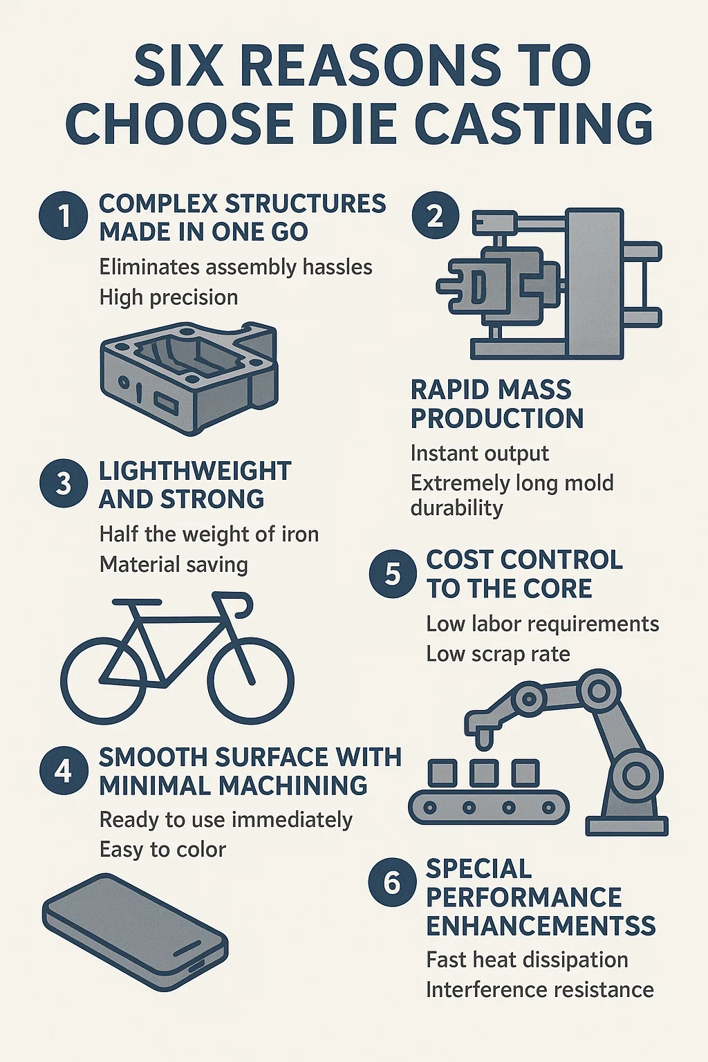 Bersedia untuk digunakan dengan serta-merta: Bahagian-bahagian die-cast mempunyai kilauan logam semulajadi (seperti bezel telefon baru), menghapuskan keperluan untuk menggilap.
